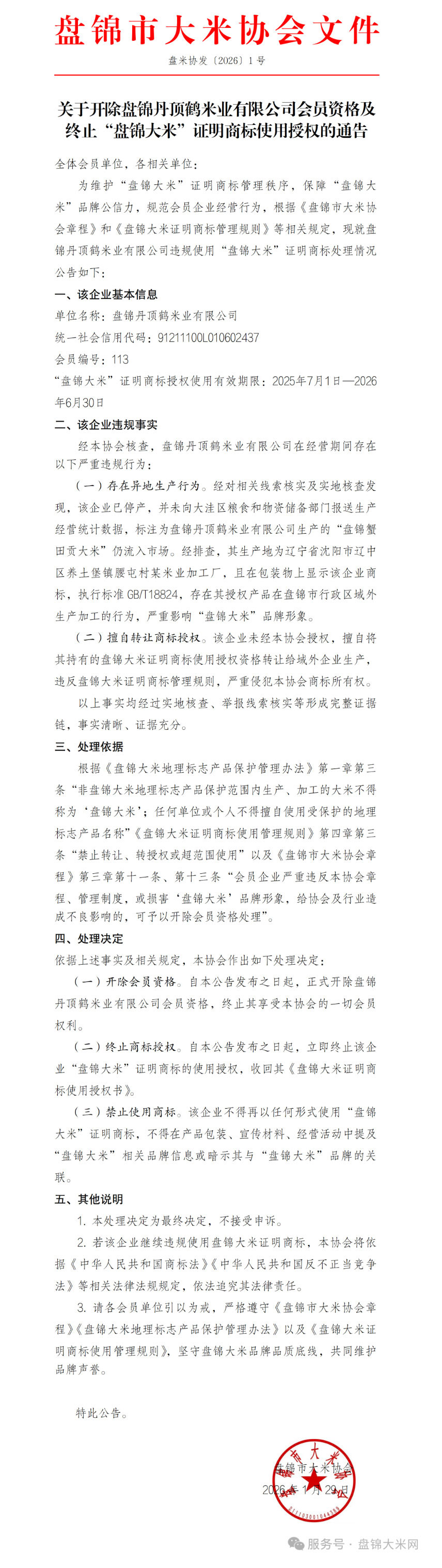 关于开除盘锦丹顶鹤米业有限公司会员资格及终止“盘锦大米”证明商标使用授权的通告